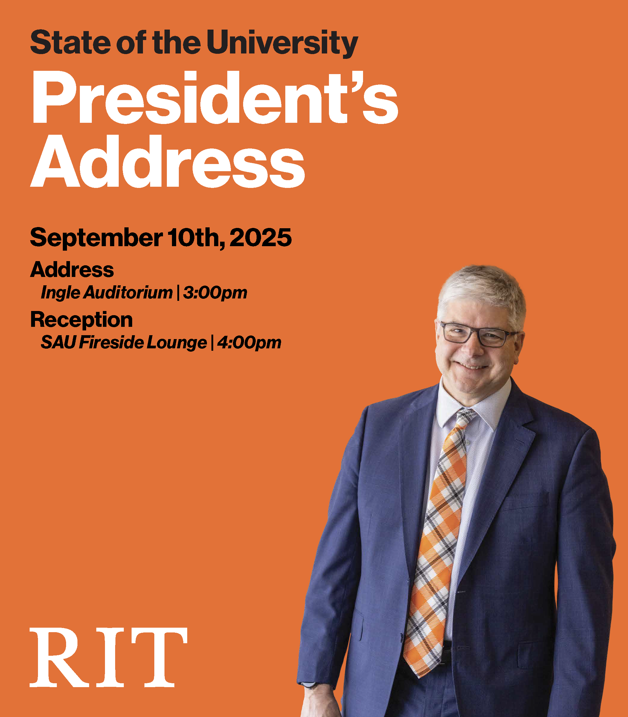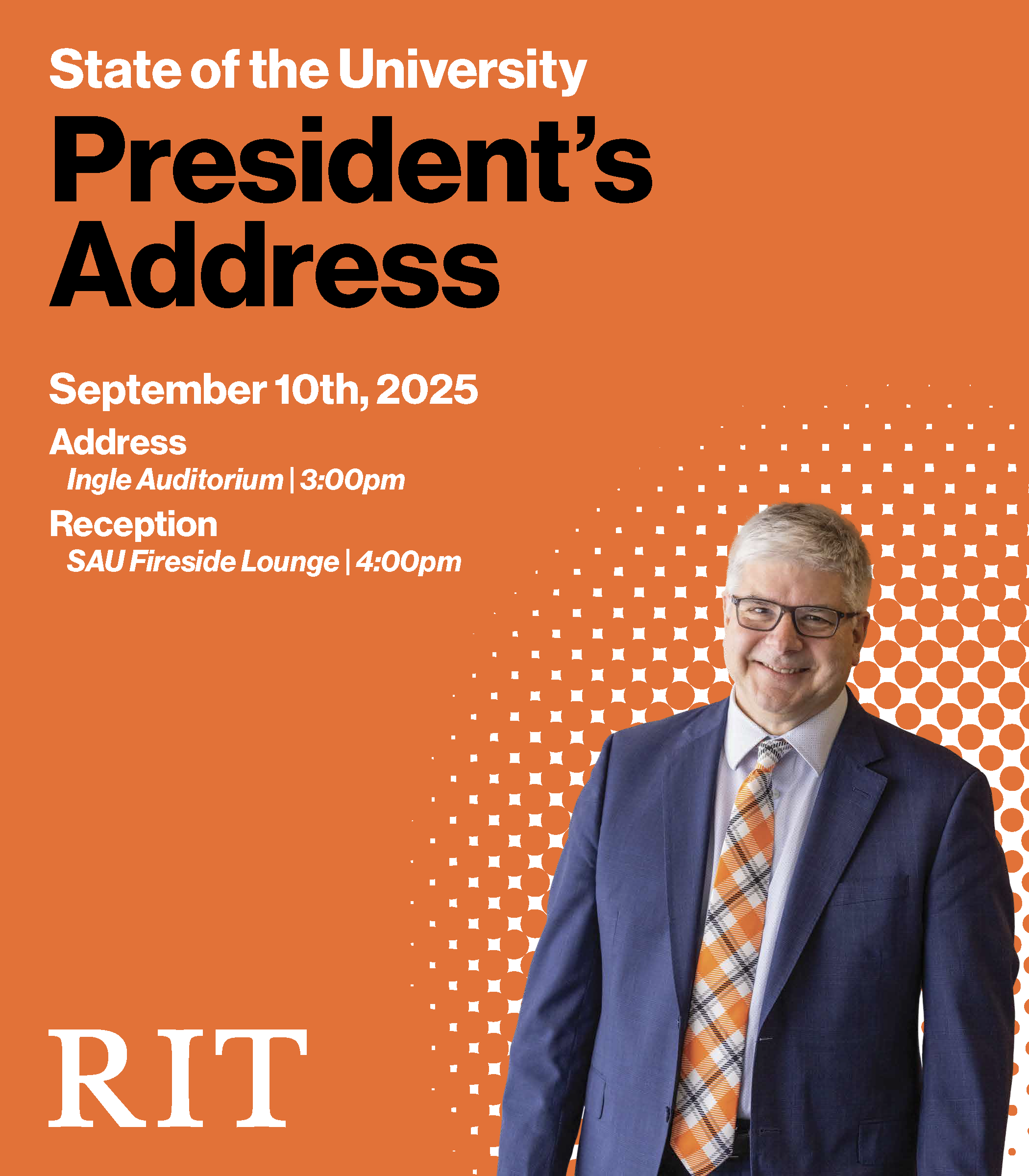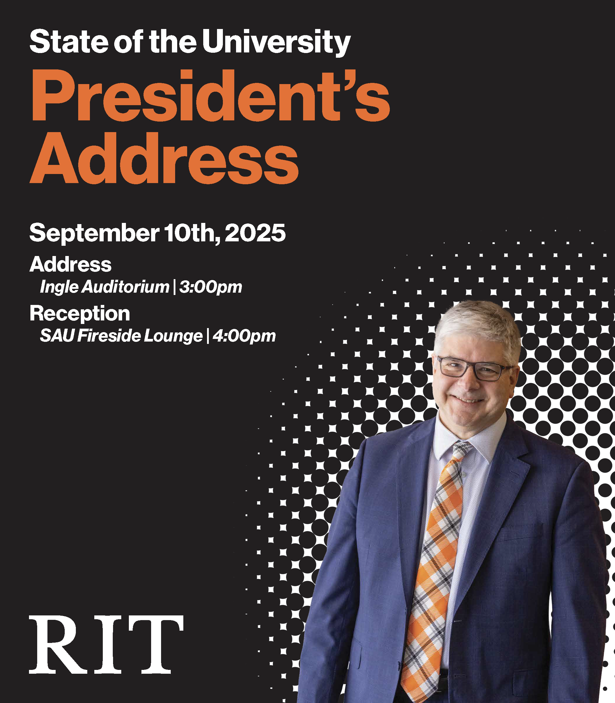 Created with Adobe Illustrator, this impactful event sign was designed for the RIT President's Welcome and State of the University Address. The design adheres to RIT brand guidelines, ensuring a consistent and professional look. It was praised by RIT's new President Bill Sanders, who personally autographed my work, and RIT's Chief Communications Officer, who requested a copy for the Marketing and Communications office. This project demonstrates my ability to produce high-quality, on-brand materials that exceed client expectations.