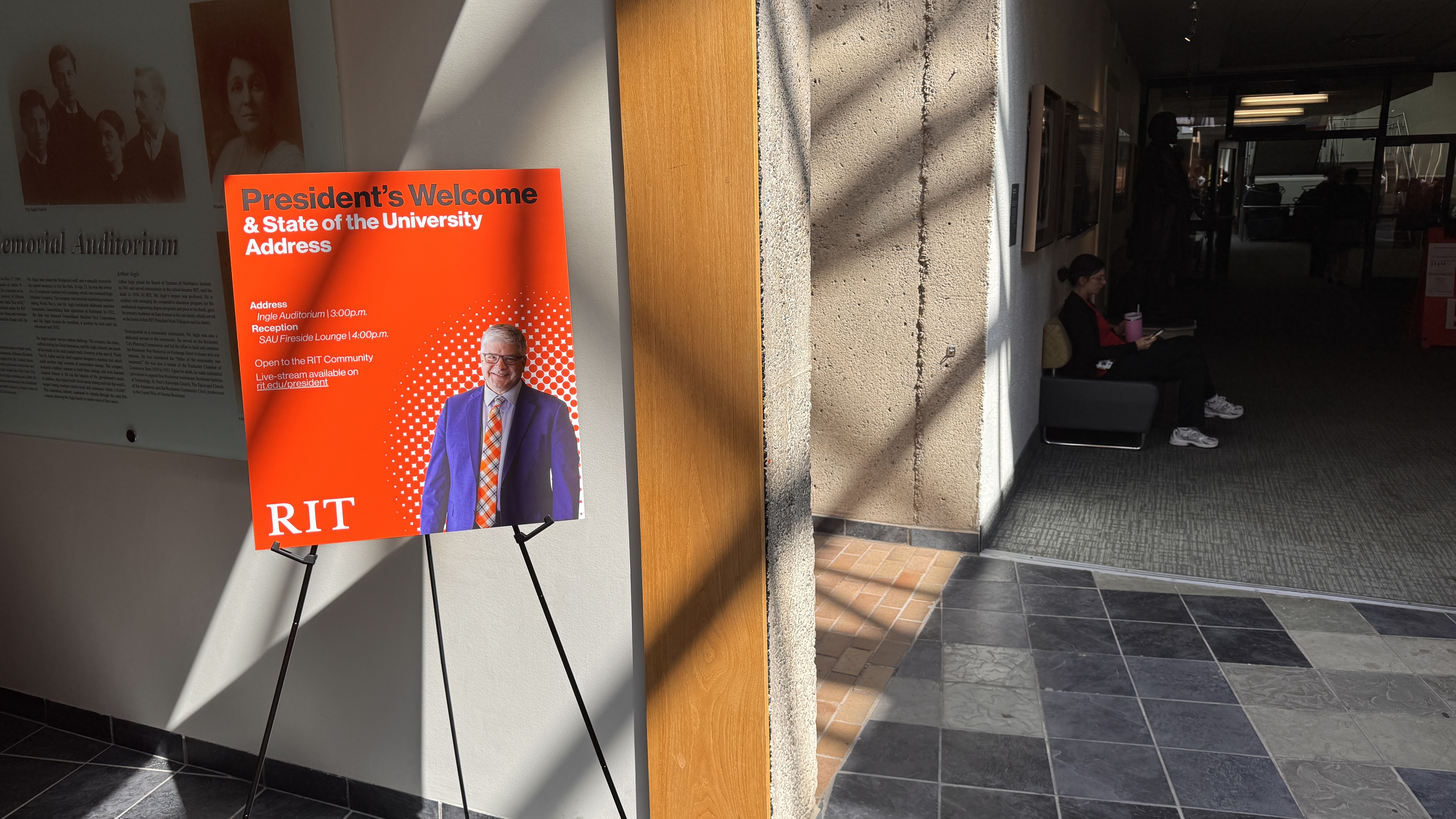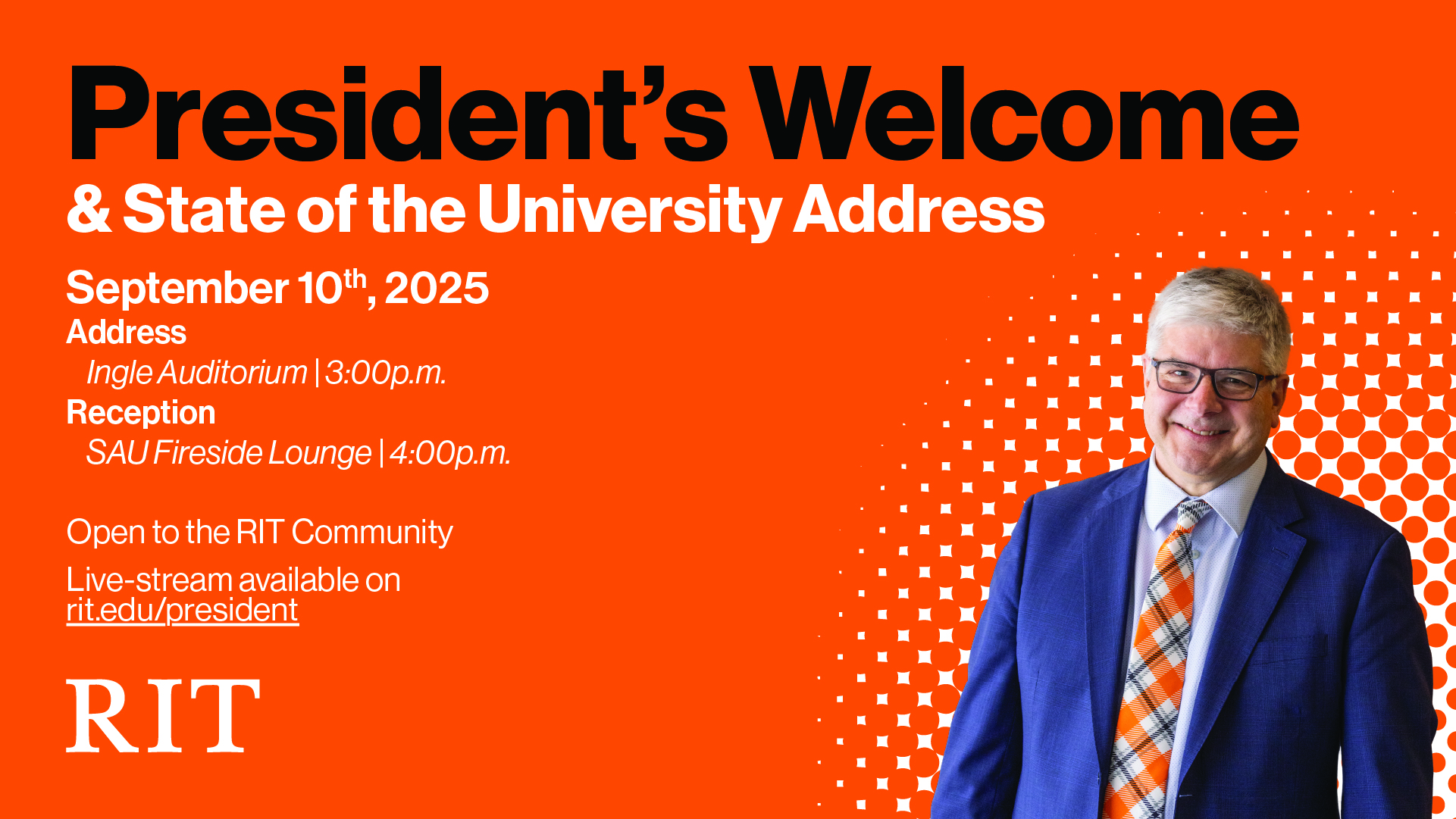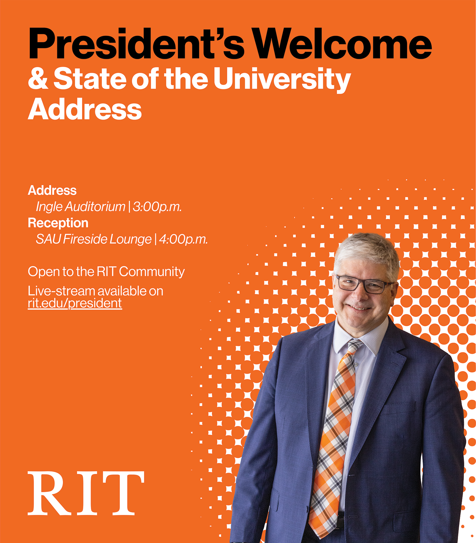 Created with Adobe Illustrator, this impactful event sign was designed for the RIT President's Welcome and State of the University Address. The design adheres to RIT brand guidelines, ensuring a consistent and professional look. It was praised by RIT's new President Bill Sanders, who personally autographed my work, and RIT's Chief Communications Officer, who requested a copy for the Marketing and Communications office. This project demonstrates my ability to produce high-quality, on-brand materials that exceed client expectations.